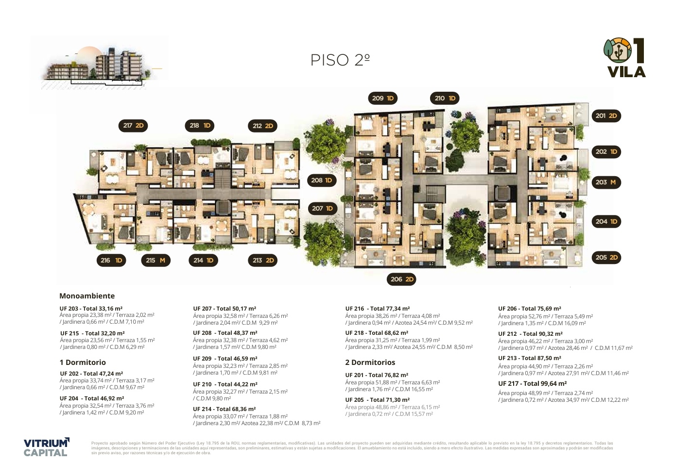Todas las unidades cuentan con una gran expansión exterior (balcones, terrazas o jardines) con vegetación incorporada.