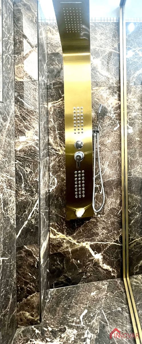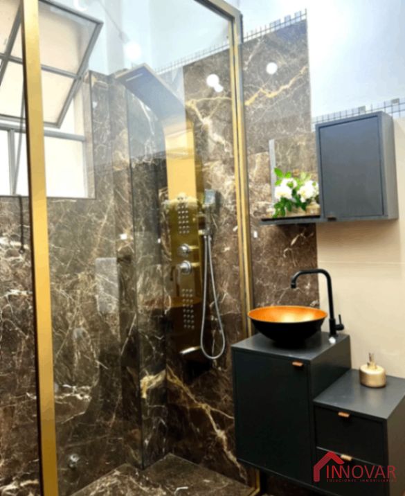 – Baño de gres, ducha escocesa en terminación bronce, mampara de vidrio templado y accesorios en símil bronce.