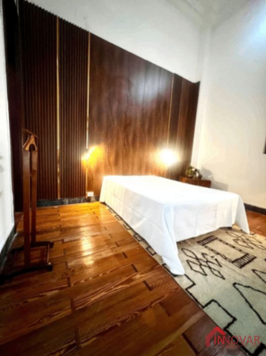 – Dormitorio principal espacioso, pared revestida en madera, luces de diseño empotrada, escritorio de estilo.
